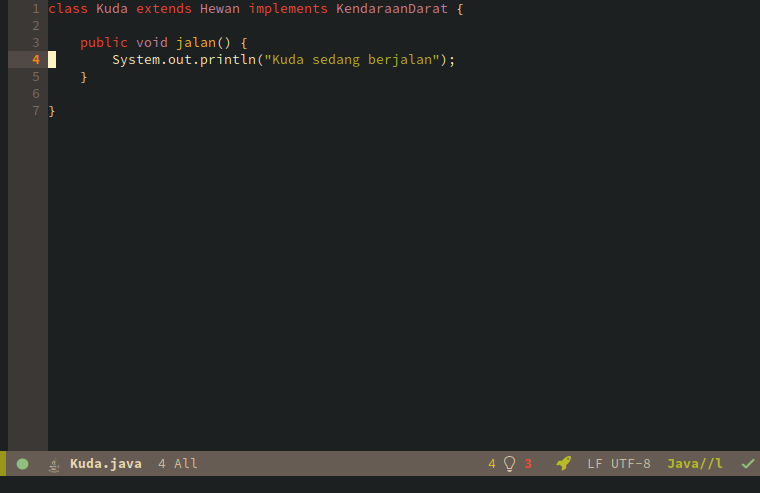 Kemudian kita bisa mengimplementasikan interface tadi ke class Kuda dan Mobil